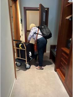 from the car using a luggage trolley. We made our way to a ground floor room. On the way I saw umbrellas in a bucket at the